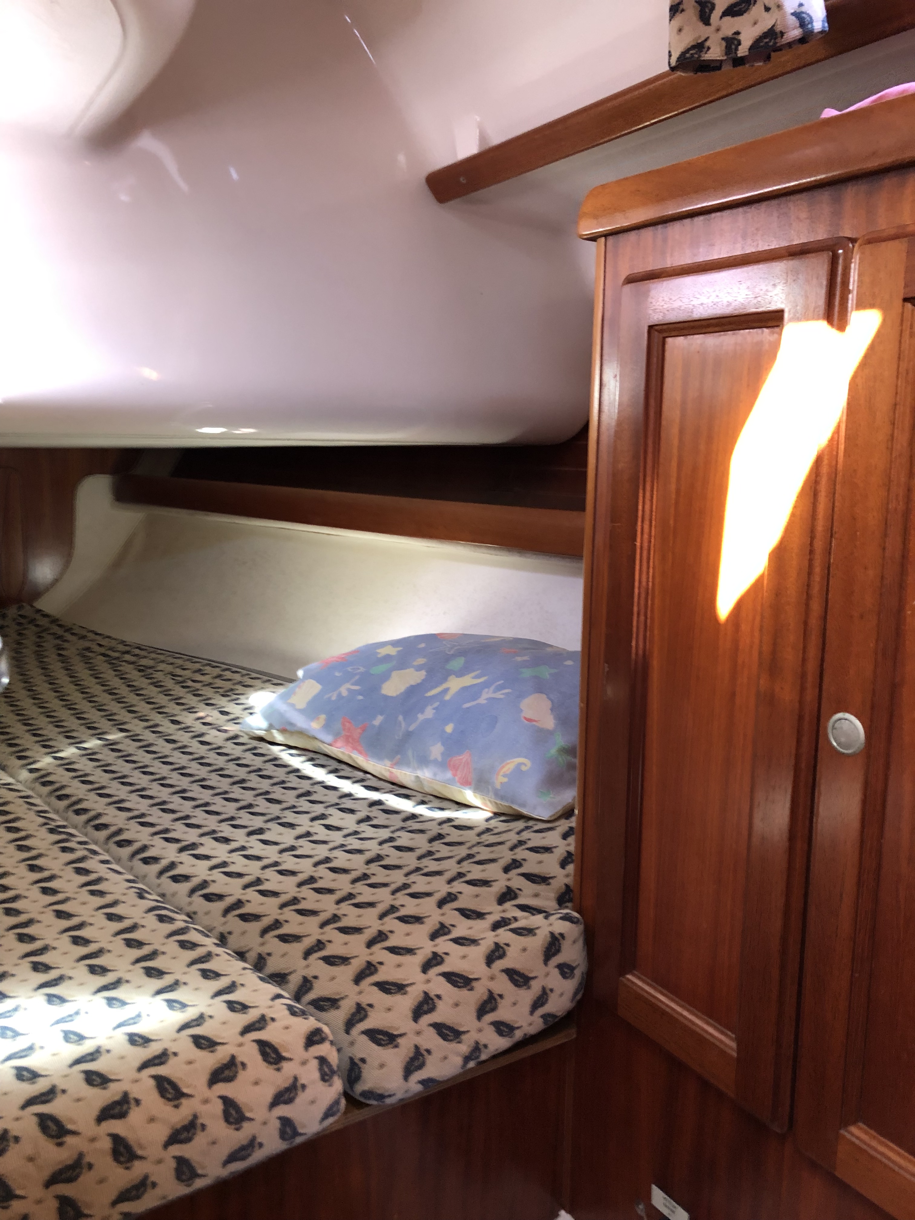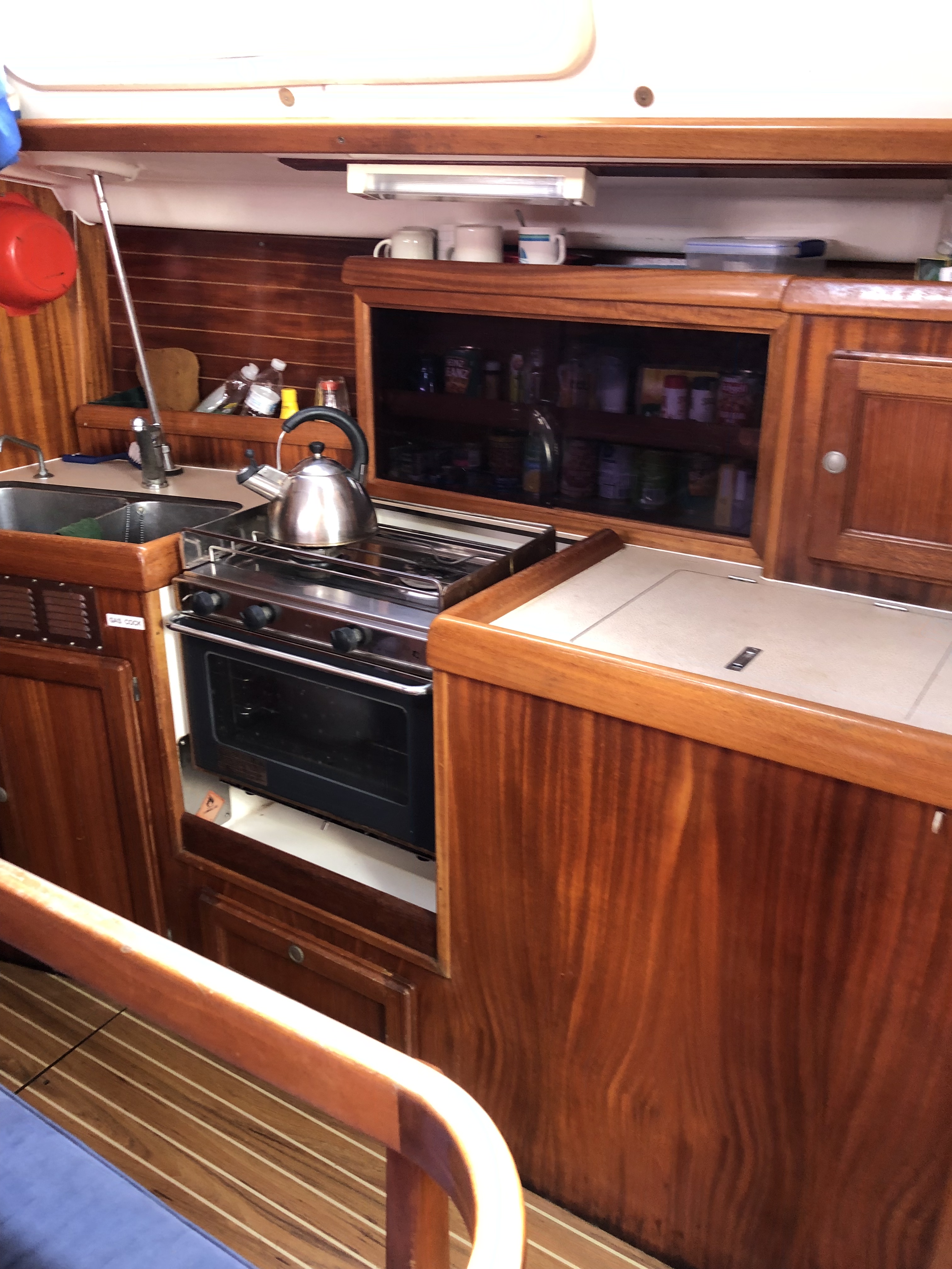 Enough room for all 3 of us and take some friends. It’s a 3 cabin interior, 36 foot so roughly 11 metres long. The interior is well designed for maximum space with lovely timber. A good size galley with plenty of work bench and good natural light coming in with good ventilation.