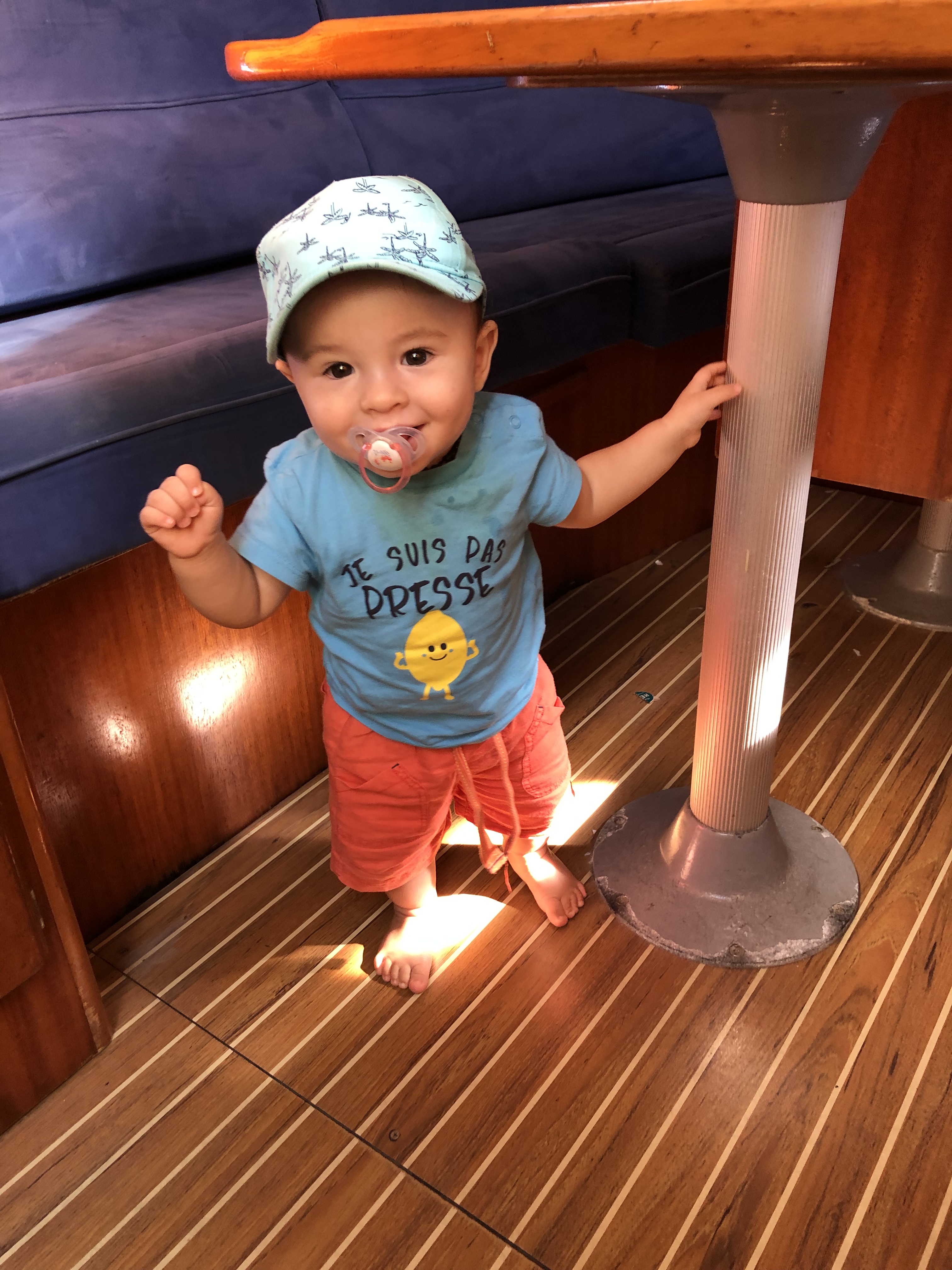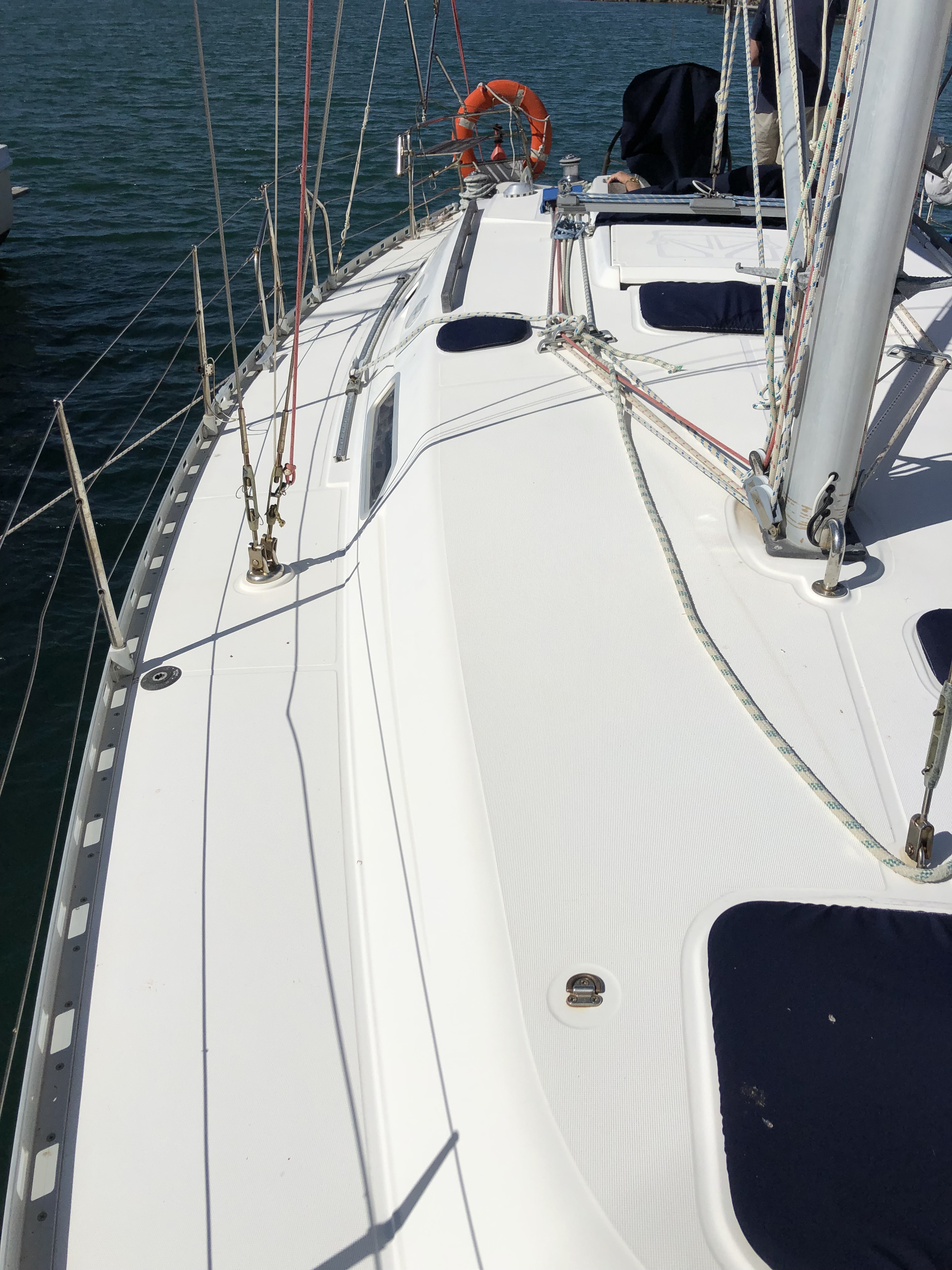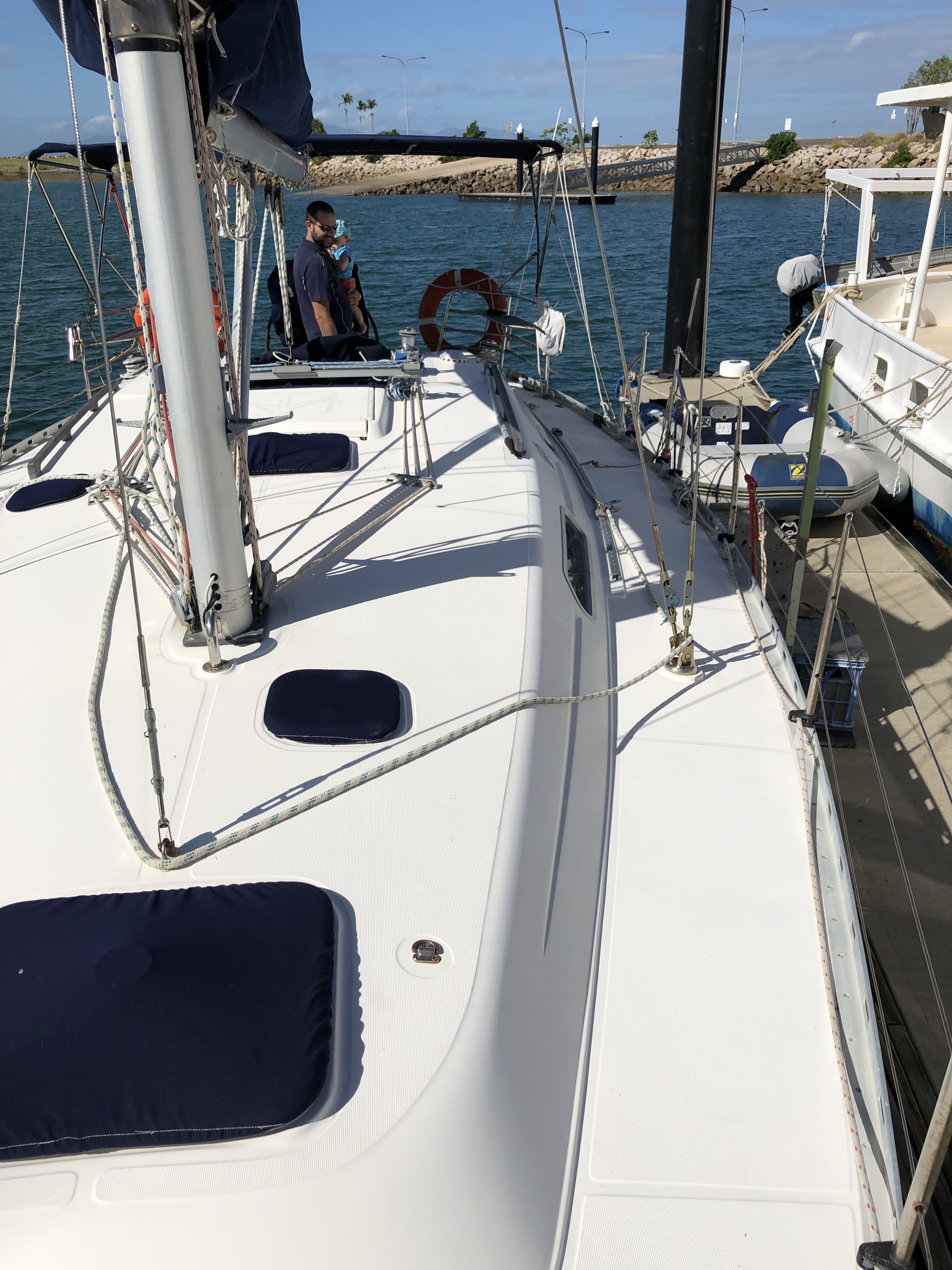 The deck has quite a large bimini which is perfect to add some solar panels, hatches have covers and I like the triple lifelines around the boat for child safety, I will add a netting also for extra protection.